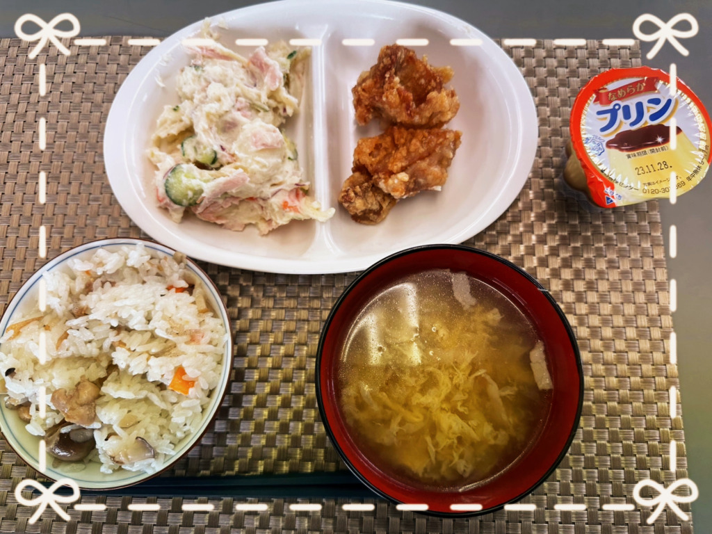 まんてん・アモーレ・ステラ・コア:きのこの混ぜご飯・ふわとろ玉子スープ・ポテトサラダ・鶏のから揚げ・プリン